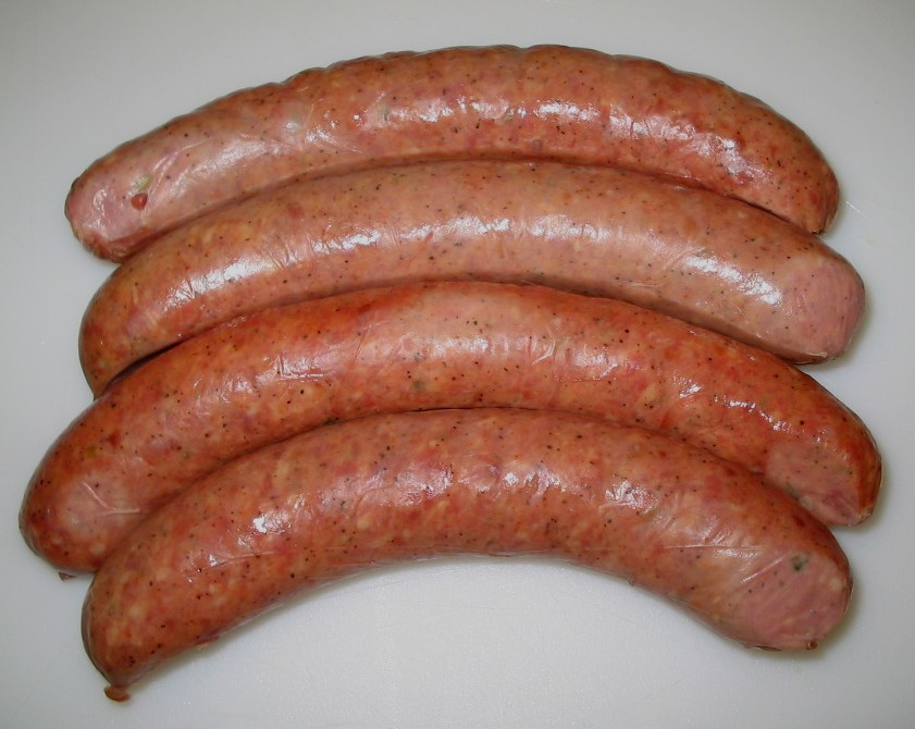 | Sausage - meat that is cut into very small pieces and made into a long, thin shape; it can be eaten hot or cold. |