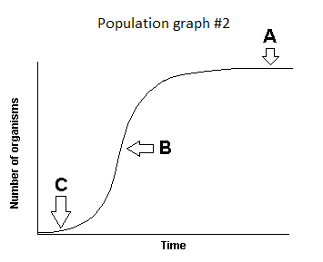 Why does the population level off at A?,  | Limiting factors in the ecosystem restrict growth. |