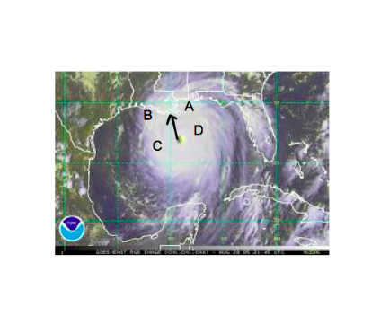 If wind speed of hurricane is 90 mph and it is moving at 10 mph, what is wind speed at C,  | 80 mph,  |