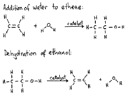| Hydration reaction | Chemical reaction in which a hydroxyl group (OH-) and a hydrogen cation (an acidic proton) are added to the two carbon atoms bonded together in the carbon-carbon double bond which makes up an alkene functional group.,  |
