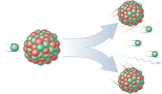 | Fission | The splitting of the nucleus of an atom into nuclei of lighter atoms, accompanied by the release of energy.,  |