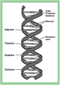 | DNA | A long linear polymer found in the nucleus of a cell and formed from nucleotides and shaped like a double helix; associated with the transmission of genetic information,  |