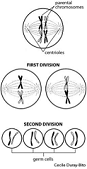 | Meiosis | The process of two consecutive nuclear divisions in the formation of germ cells in animals and of spores in most plants, by which The number of chromosomes ordinarily is reduced from the diploid, or double, number found in somatic cells to the haploid, or halved, number found in gametes and in spores.,  |