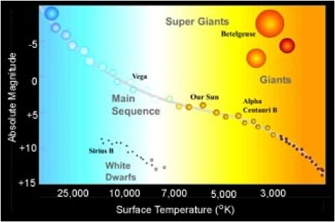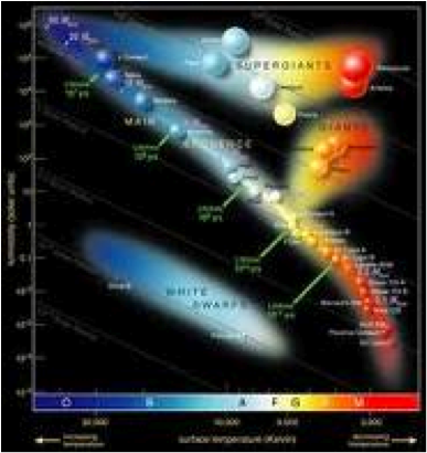 | Hertzsprung Russell | A graph of stars. It plots each star on the graph in accordance with it's absolute magnitude or it's brightness against it's color and temperature.,  |