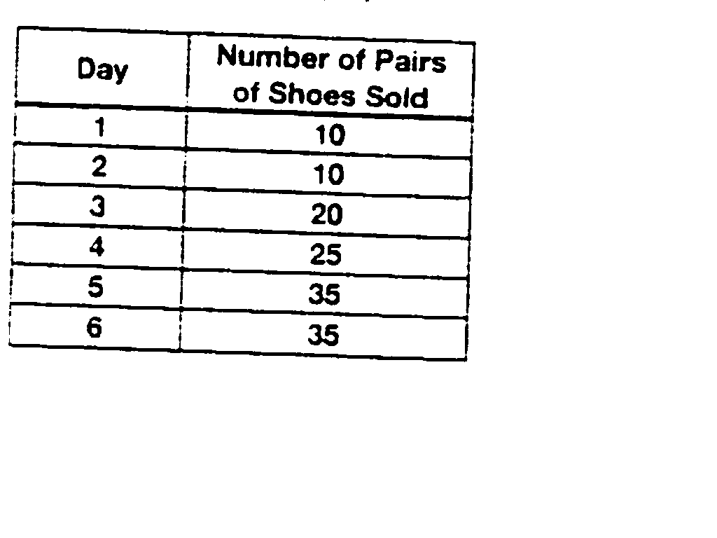 The table below shows the number of shoes Robert sold over the last 6 days. How many more pairs of shoes did Robert sell on the fifth day than on the third day?,  | 15 more pairs (35 - 20 = 15) |