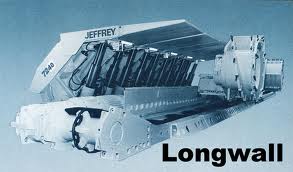 longwall mining machine,  | a cutting machine that works along walls of coal up to 1,000 feet long to cut coal and drop it onto a conveyor belt. |