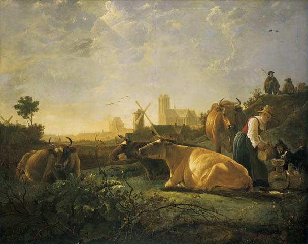 | A Distant View of Dordrecht, with a Milkmaid and Four Cows, Cuyp (Dutch) |