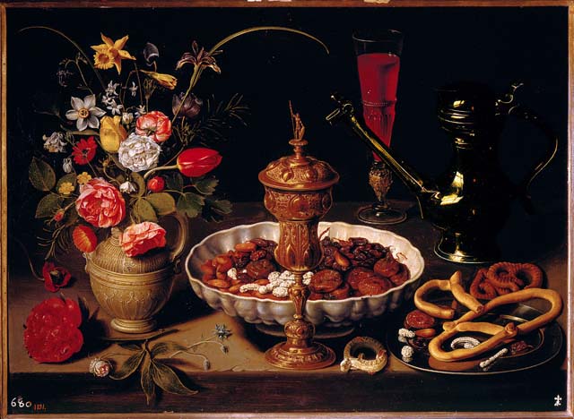 | Still Life with Flowers, Goblet, Dried Fruit and Pretzels, Clara Peeters (Dutch) |