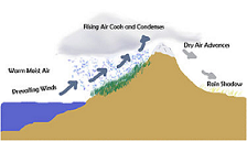 Lee Rain Shadow | A region in the lee of mountains that receives less rainfall than the region windward of the mountains.,  |