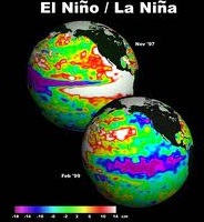 El Nino | An irregularly occurring and complex series of climatic changes affecting the equatorial Pacific region and beyond every few years, characterized by the appearance of unusually warm, nutrient-poor water off northern Peru and Ecuador, typically in late December.,  |