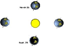 Equinox | The time or date (twice each year) at which the sun crosses the celestial equator, when day and night are of equal length (about September 22 and March 20).,  |