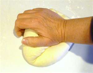Knead,  | To work a ball of dough with heels of the hands repeating press, fold, and turn motions until the dough is smooth and elastic |