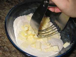 Cut-in,  | To combine flour and solid fat by cutting the fat into tiny pieces using a pastry blender, two forks or knives, or the hands |