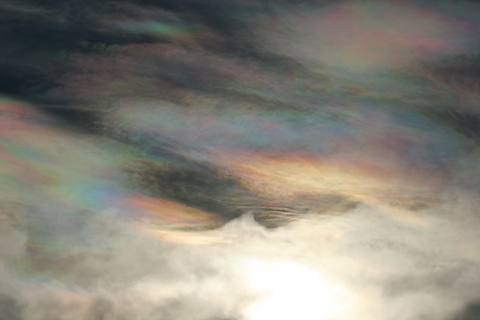 iridescent,  | adj. a lustrous rainbowlike play of color caused by differential refraction of light waves (as from an oil slick, soap bubble, or fish scales) that tends to change as the angle of view changes |