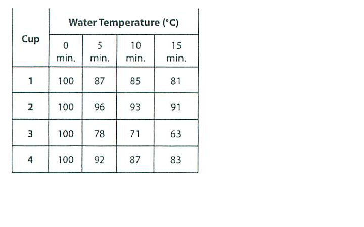 Boiling water was placed in four cups. Based on the data below, which cup was the best conductor of heat?,  | Cup 3 |
