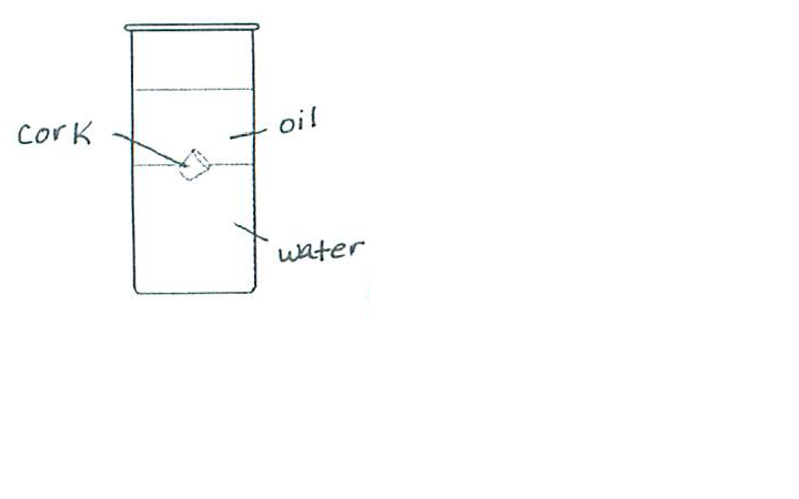 Water and oil are poured into the same container. A cork is added. The materials are allowed to sit and their final positions are shown in the illustration. What is the most reasonable conclusion that can be made from this test? A) Cork has the lowest density, B) Water is less dense than oil. C) cork is less dense than water. D) Water has the least density.,  | Cork is less dense than water. |
