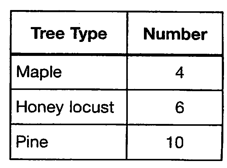 The table shows the number of trees of each type that were planted in the city park last year. What fraction of the trees planted were maples?,  | 1/5 |