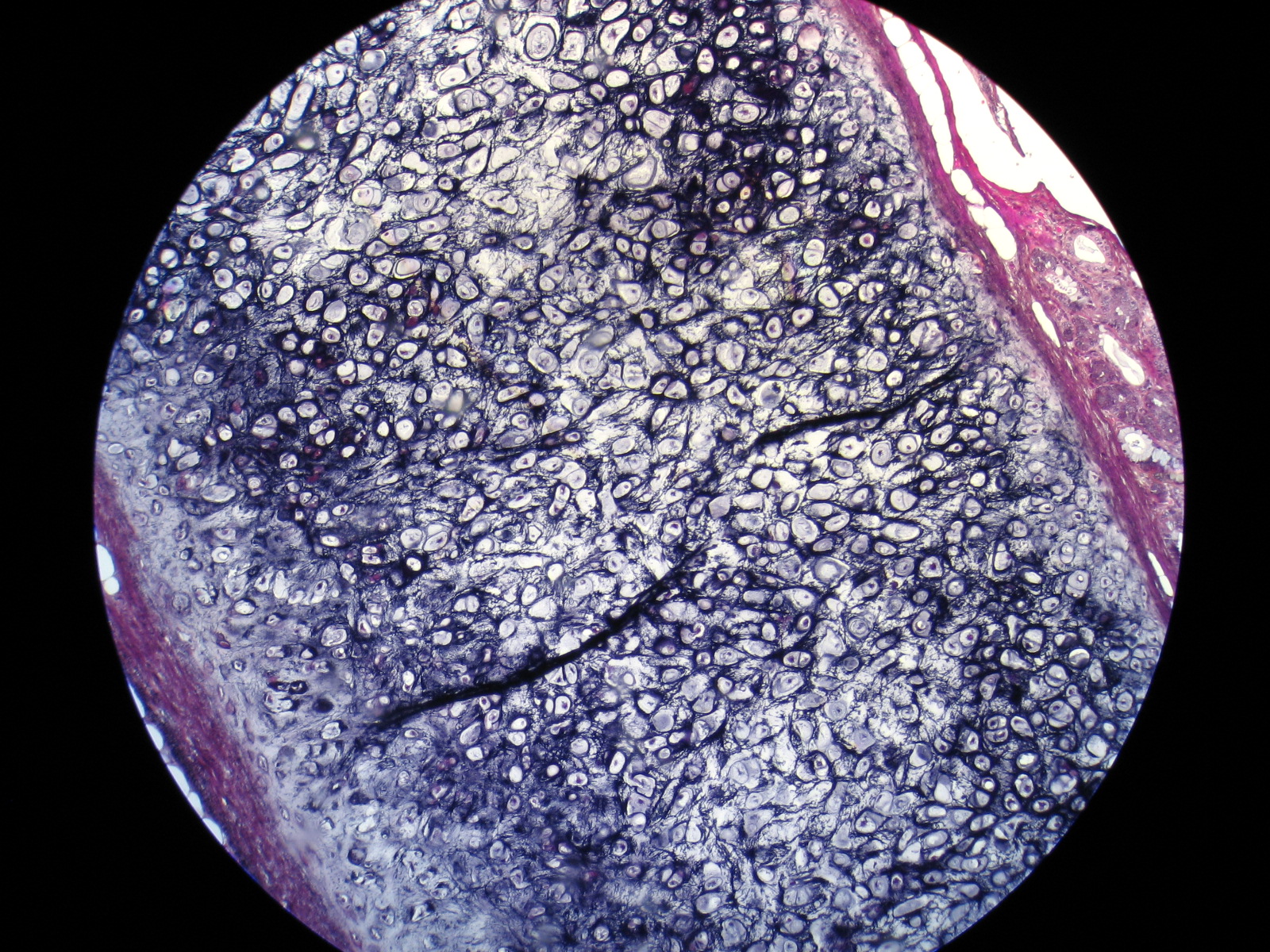| Elastic cartilage, lacunae, chondrocytes, elastic fibers |