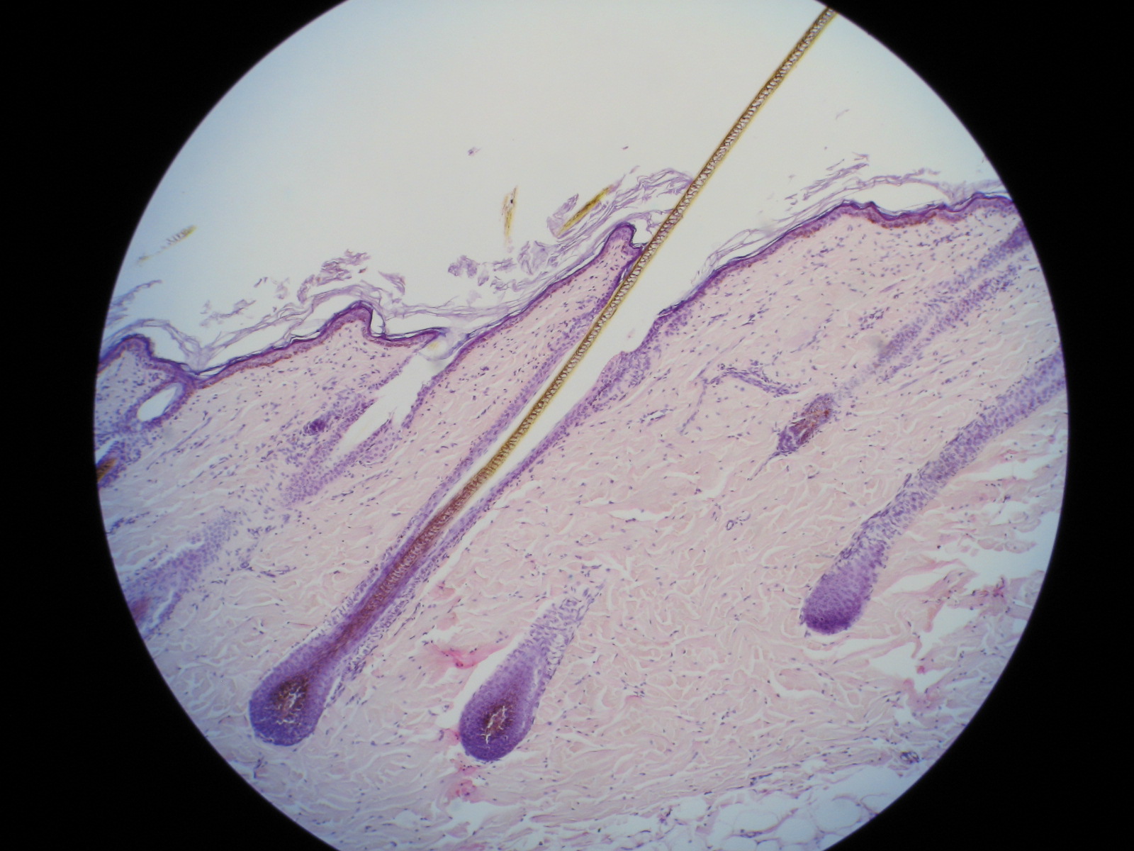 Identify the zones, layers, and gland associated with the hair filament.,  | bulb, root, shaft, medulla, cortex, sebaceous gland |