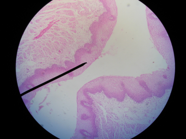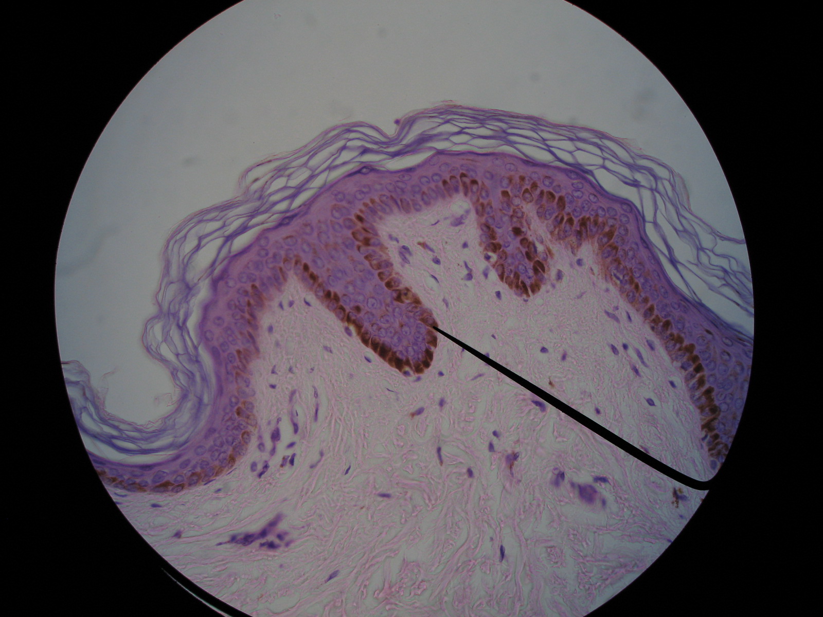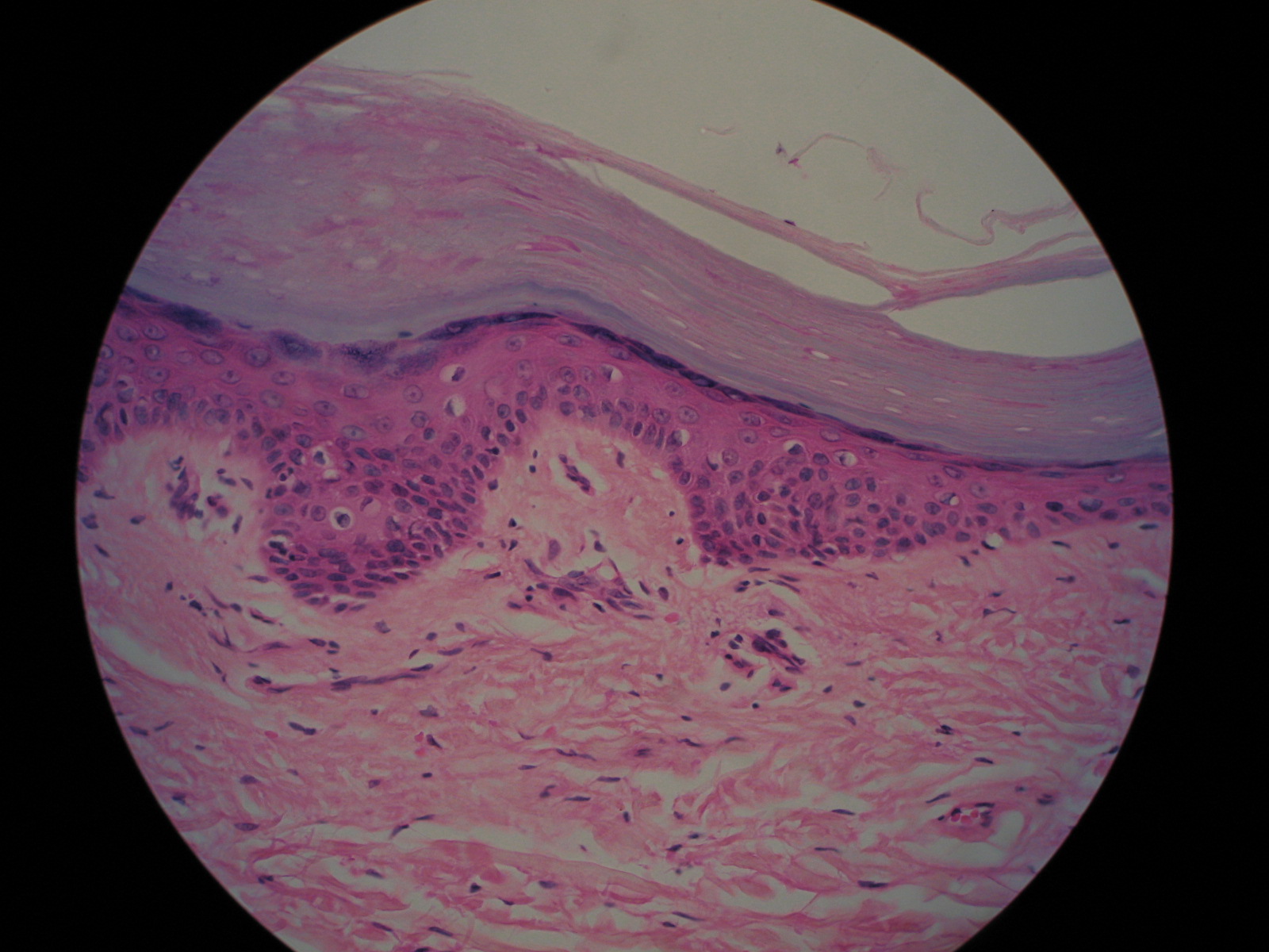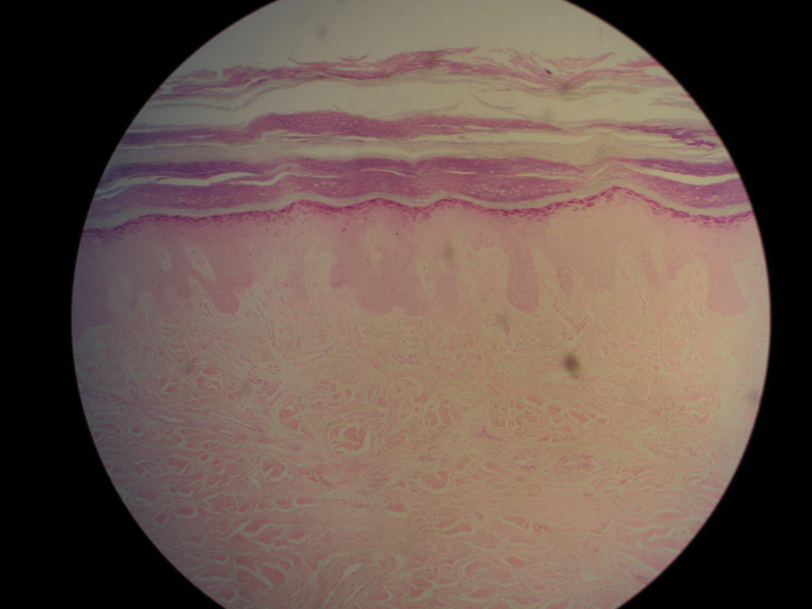 Name the tissue types for each of the layers.,  | Epidermis- keratinized stratified squamous; Papillary- areolar; Reticular layer- dense irregular |