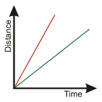 What does this distance-time graph tell you about the motion of these two objects??,  | Both objects are moving at a constant speed, but the red line object is moving at a faster speed.,  |
