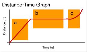 What does this distance-time graph tell you about this object's motion?,  | During segment A, it is at a constant speed, then it stops during segment B, and it increases its speed during segment C,  |