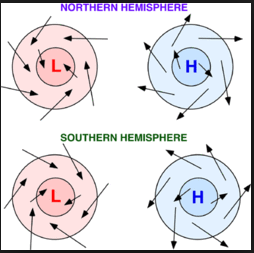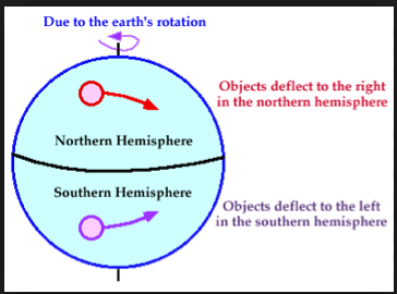 | Coriolis Effect | Moving objects (air) are deflected (bent) because of Earth's rotation. Northern hemisphere = deflected right. Southern hemisphere = deflected left.,  |