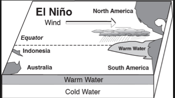 | El Nino / La Nina | Trade winds slow down in Central/Eastern Pacific Ocean, creating warmer water in the Eastern Pacific. This creates more rainfall and storms along western South America and droughts in Australia. La Nina is the opposite of El Nino: cooler temperatures in the Eastern Pacific waters.,  |