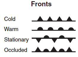 | Frontal Boundary (Front) | The transition between two air masses. Includes: Cold front, Warm front, Occluded front, Stationary front. The front symbols on a map show the direction the front is moving in.,  |