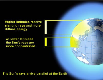| Insolation | Incoming solar radiation (sunlight!) When the angle of insolation is direct (ex: at the equator), the temperature is warmer.,  |