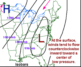 | Isobar | A line on a weather map that has equal pressure. Isobars close together = windy. High pressure = above 1013 mb, Low pressure = below 1013 mb.,  |