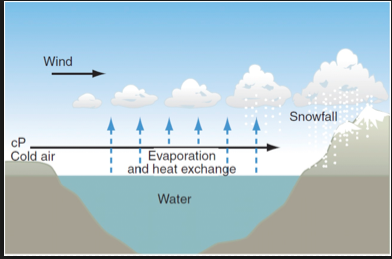 | Lake Effect Snow | Cold air mass moves over warmer lake water, water vapor from the lake evaporates, rises, cools and condenses to form snow. Occurs in the Greak Lakes region of New York.,  |