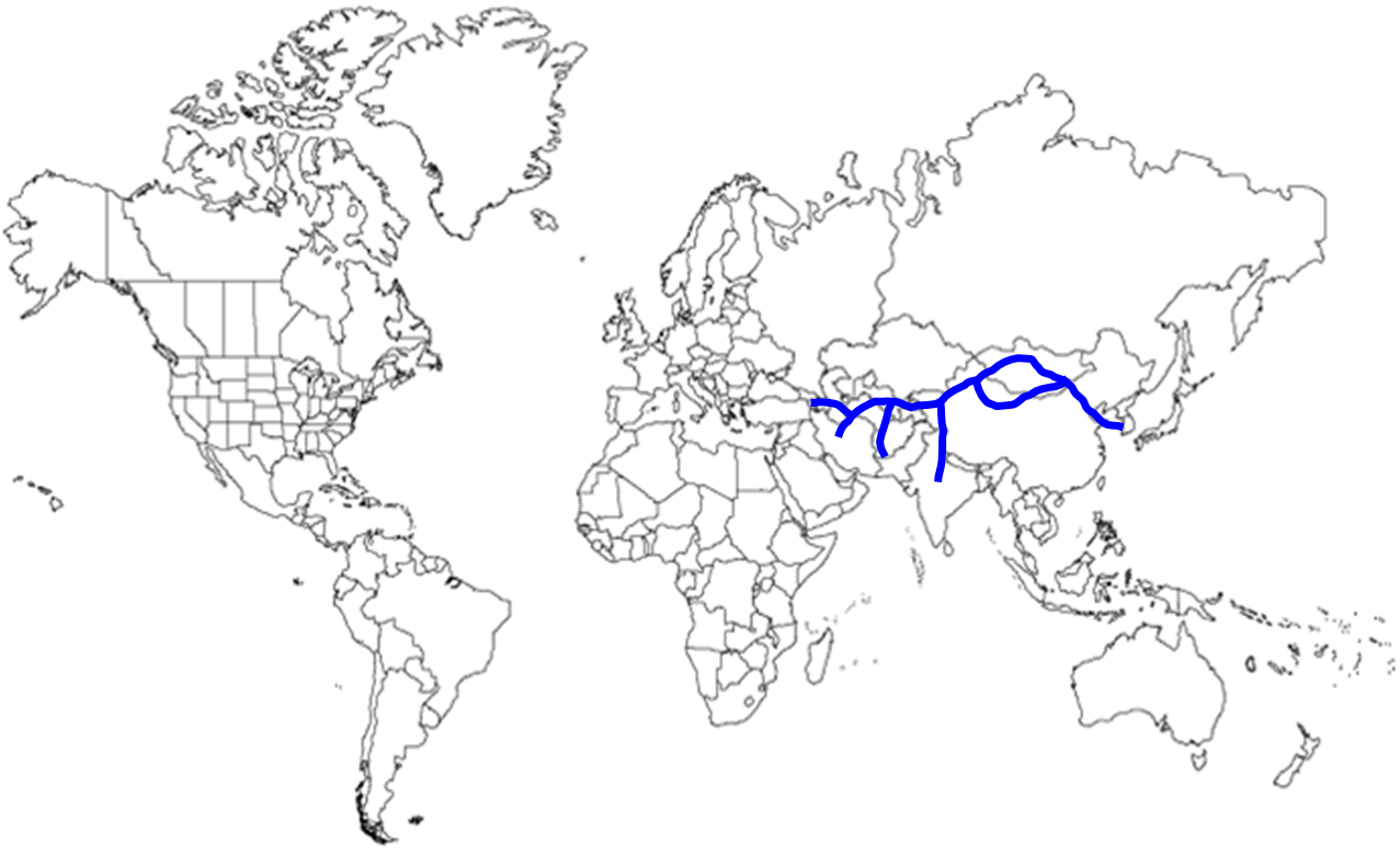 | silk road | trade routes from Asia to the Mediterranean Basin,  |