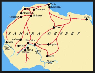 | Trans-Saharan | trade routes crossing Africa’s Sahara Desert,  |