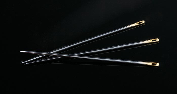 hand sewing needle,  | This needle has an eye at one end and a point at the other end. |