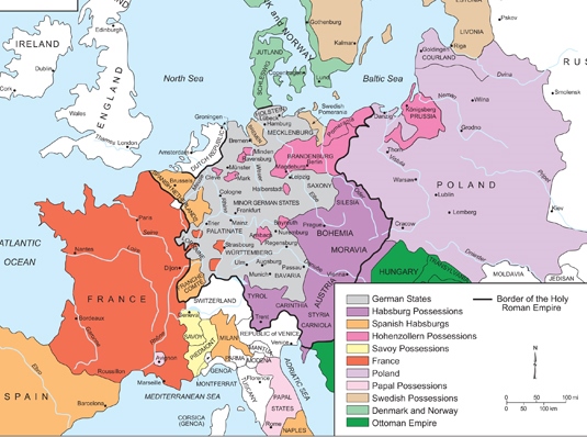 After which war, and which peace settlement, would this map accurately illustrate?,  | Europe: 17th century, redrawn after the 30 Years War and Peace of Westphalia-1648 |