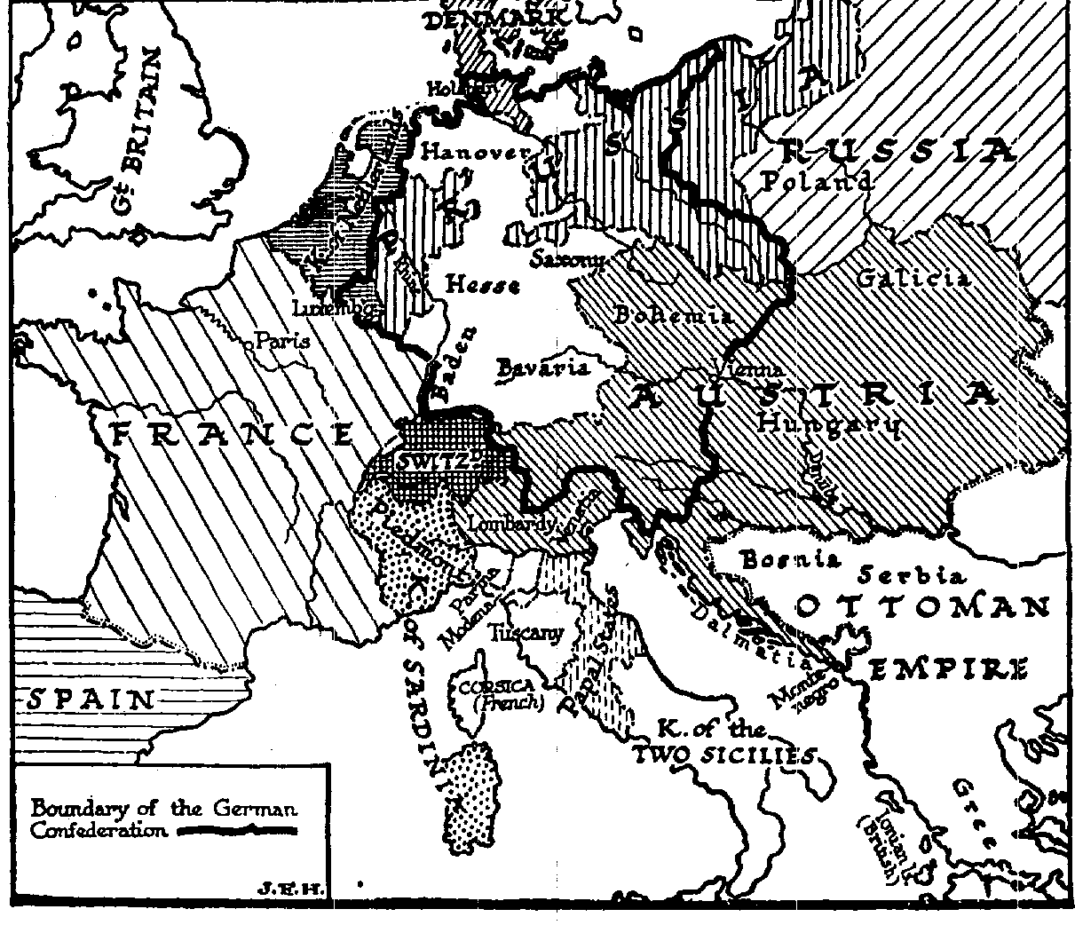 After which war, and which peace settlement, would this map accurately illustrate?,  | Europe: 19th century; after the Napoleonic Wars and Congress of Vienna |