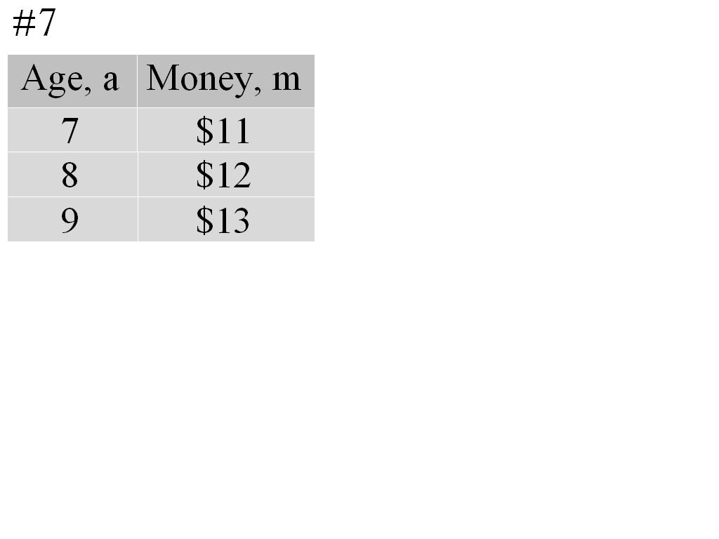 The table shows the amount of money, m, that Julius received for doing chores as he got older. Which equation describes the relationship between Julius's age, a, and the amount of money he received, m? a) a x 2 = m b) a + 5 = m c) a + 4 = m d) a - 3 = m,  | c) a + 4 = m (take each age and add 4 to get the amount of money) |