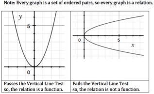 | vertical line test | A graph in the coordinate plane defines y as a function of x if and only if no vertical line intersects the graph in more than one point.,  |