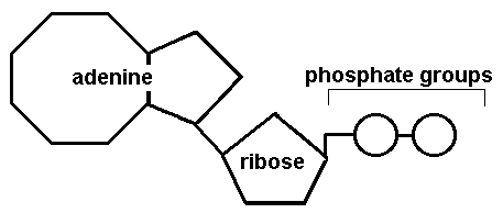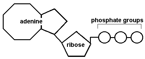 Name the parts of ATP.,  | adenine, ribose, and three inorganic phosphate groups |