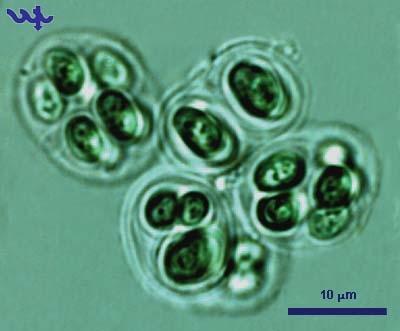 spherical or filamentous cells surronded by gelatinous sheath--photosynthetic pigments-(chloroplasts gree),  | -Cyanobacteriablue green algae |