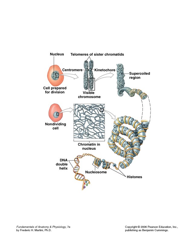 | Chromatin: | loosely coiled DNA (cells not dividing),  |