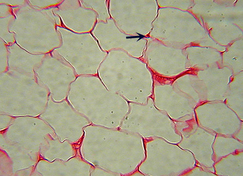 transverse section view,  | Simple Squamous Epithelium-- Identification: Small, flat cells arranged around large, empty circles (air sacs). May be confused with Adipose Tissue, but note the multiple cells and nuclei (arrows). ---Features to Know: nuclei. |
