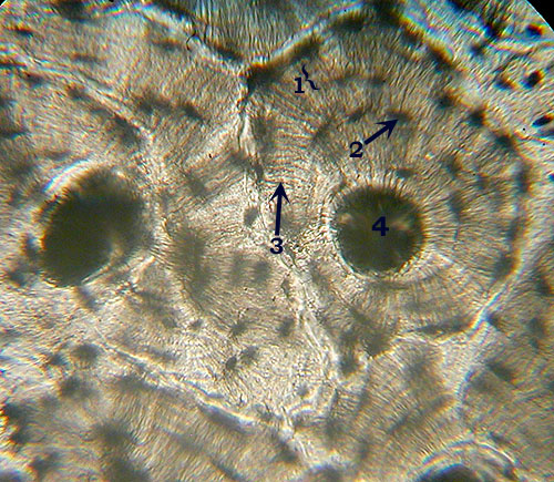 --?,  | (Compact) Bone Identification: Concentric rings (like tree rings) are unmistakable. Features to Know: lamellae (1), osteocytes in lacunae (2), canaliculi (3), Haversian canal (4). An entire set of concentric rings (lamellae) is called a Haversian System. Fibers Present: collagen fibers present but not visible. Where Located: bones . Functions: support, protection, act as levers, mineral storage. |