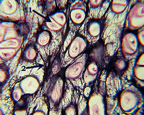 ----?,  | Elastic Cartilage Identification: Distinctive large, often paired lacunae (similar to hyaline cartilage), but note extensive dark elastic fibers (2). Features to Know: chondrocyte in lacuna (1), elastic fibers (2). Fibers Present: elastic fibers (collagen fibers are also present but not visible). Where Located: ear lobe, epiglottis (remember those Es!). Function: flexibility, bendability. |