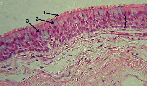 Identify?,  | Pseudostratified Columnar Epithelium--- Identification: Tall rectangular cells, with multiple irregular rows of nuclei (bracketed; compare to simple columnar, above).---- Note also goblet cells, found only here and in Simple Columnar Epithelium.--- Features to Know: cilia (1), goblet cells (2), nuclei (3). -- Where Located: trachea.-- Function: secretion and movement of mucus. |