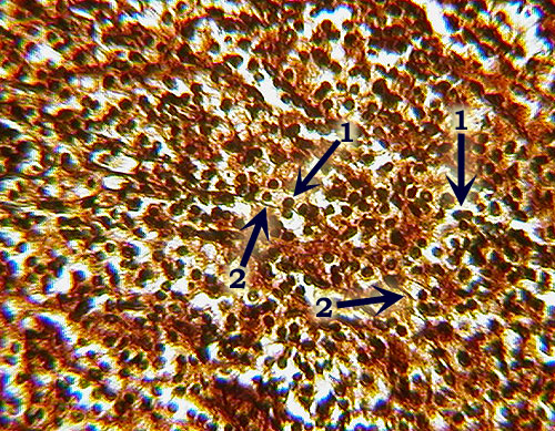 ??,  | Reticular C.T. -- Identification: Dark-staining reticular fibers (2) present, but may be obscured by the numerous nuclei of lymphoblasts and other cells (1). Overall brownish color is also distinctive. -- Features to Know: lymphoblasts (1). Fibers Present: reticular fibers (2). ---Where Located: spleen (also bone marrow, lymph nodes).-- Function: forms scaffolding to support loose cells. |