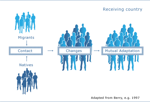 | when an individual or group adopts some of the traits of another culture | acculturation,  |