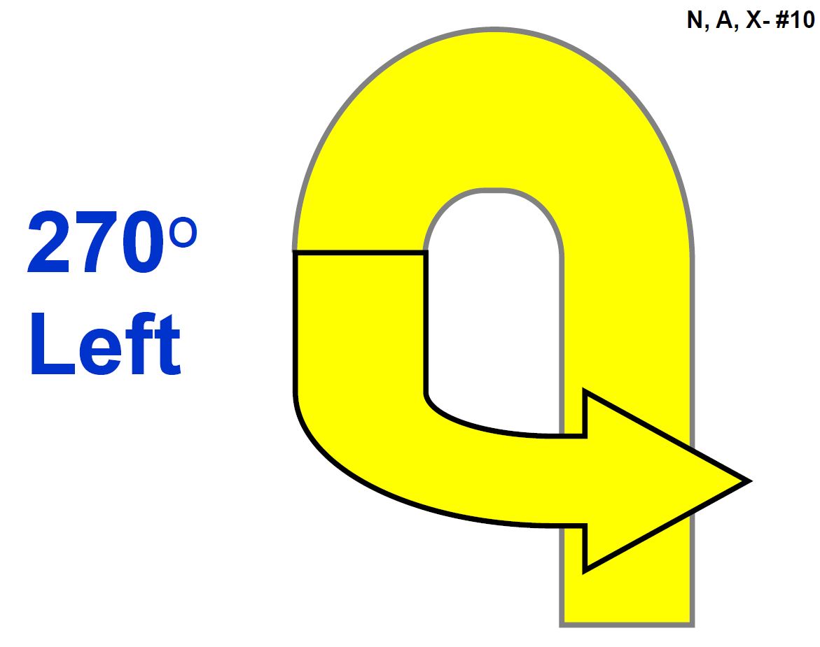 | While heeling, the team makes a 270° turn to the handler’s left. 270° turns are performed as a tight circle, but not around the exercise sign. |