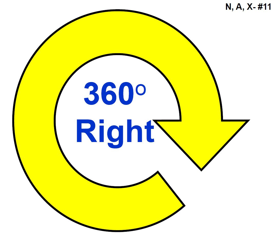 | While heeling, the team makes a 360° turn to the handler’s right. 360° turns are performed as a tight circle, but not around the exercise sign. |